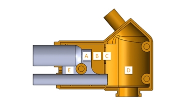 A Breathing gas inlet with nozzle B Open gap of the Benveniste principle C Opening to the pressure chamber D Pressure/volume chamber E Expiration open