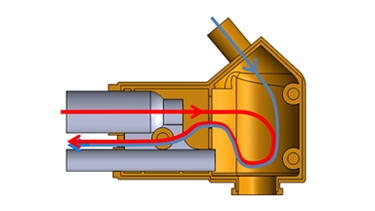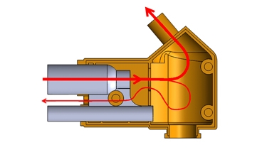 During expiration, the expiratory flow (red) from the patient meets the incoming fresh gas flow (blue). This is redirected out to the environment in whole or in parts. The patient can exhale via the expiration opening and this results in a gas mixture consisting of expiration flow and fresh gas flow (purple). During expiration, PEEP is generated when the expiratory flow coincides with the device flow.