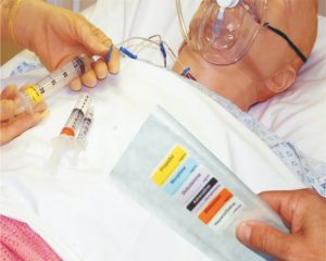 Syringe Labels – colour coded user applied labels designed to aid identification of drug type within a syringe. Clear text shows drug name with provision for dosage to be added. Supplied in rolls of 400 labels in a colour coded dispensing box.